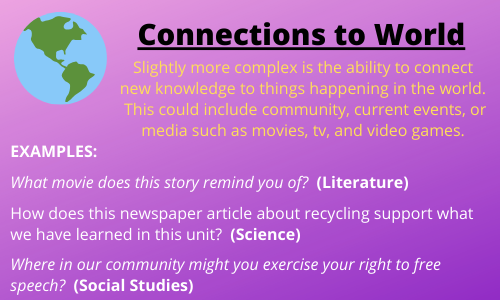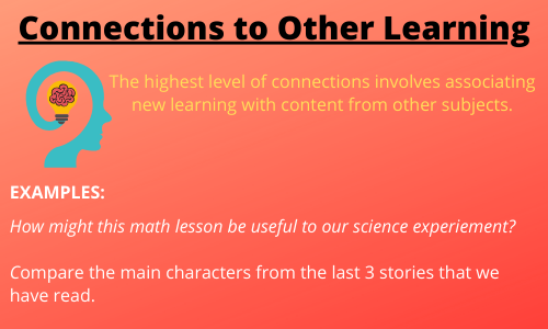 5) Teaching questions help students make connections. Successful students are able to generalize knowledge and skills beyond the classroom. Crafting questions that help students make connections to other knowledge or experiences is invaluable. Here is a basic hierarchy of making connections: